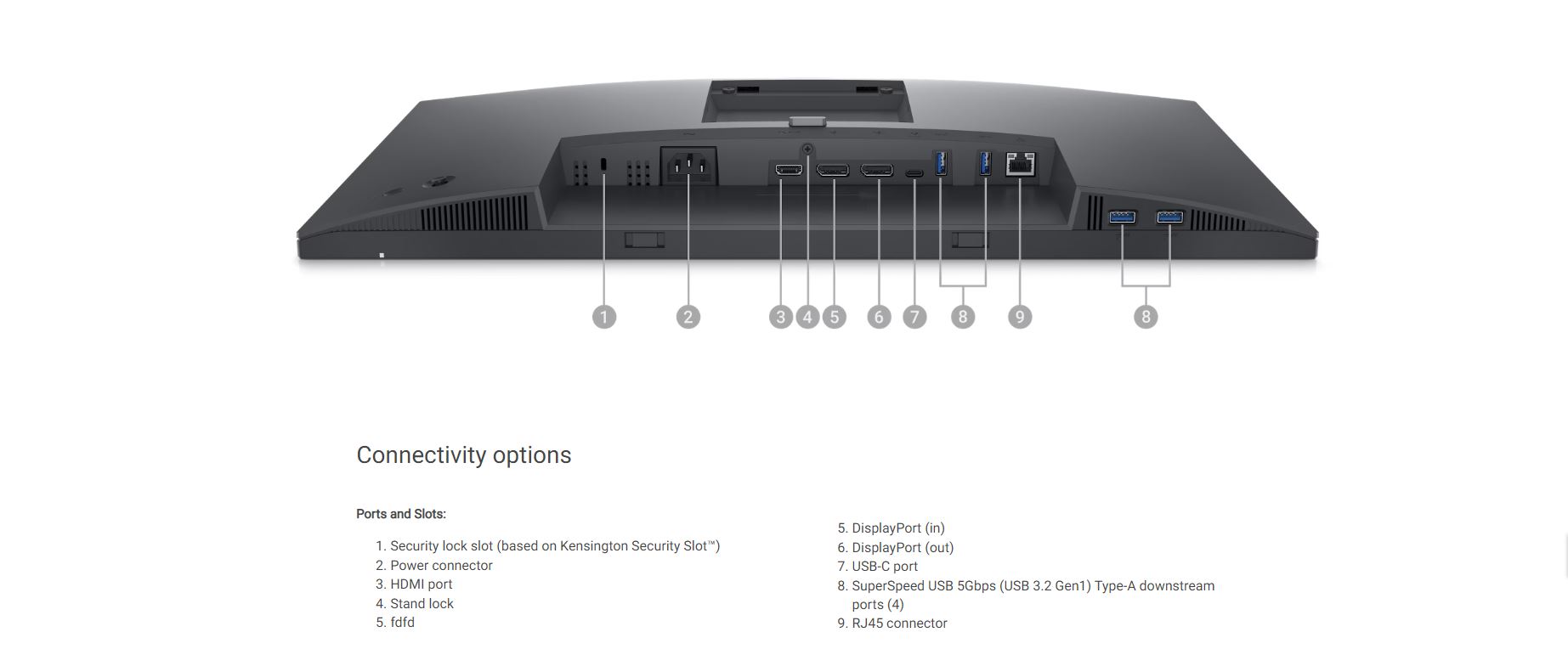 | پورتها | ۱x HDMI 1.4، ۱x DisplayPort 1.4، ۱x USB-C با Power Delivery 90W، ۳x USB 3.2 Gen1، ۱x Ethernet RJ-45، خروجی صدا ۳.۵mm |