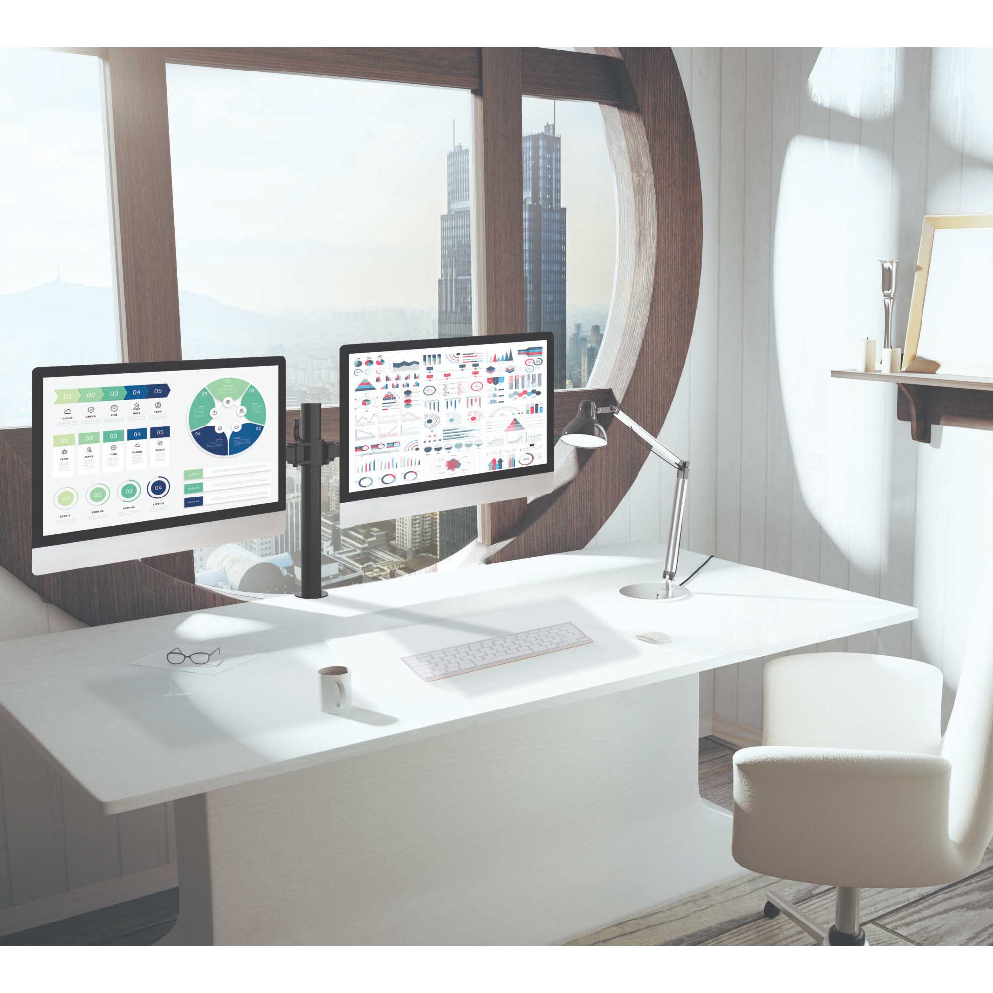 قابلیت اتصال دو مانیتور به صورت گیرهای قابلیت تنظیم ارتفاع آسان به وسیله اهرم دارای مفاصل متحرک دارای گیره نگهدارنده کابل قابلیت چرخش ۳۶۰ درجه مانیتور مناسب مانیتورهای تا وزن ۱۰ کیلوگرم با فاصله جای پیچ ۷۵x۷۵ یا ۱۰۰x۱۰۰ میلیمتر